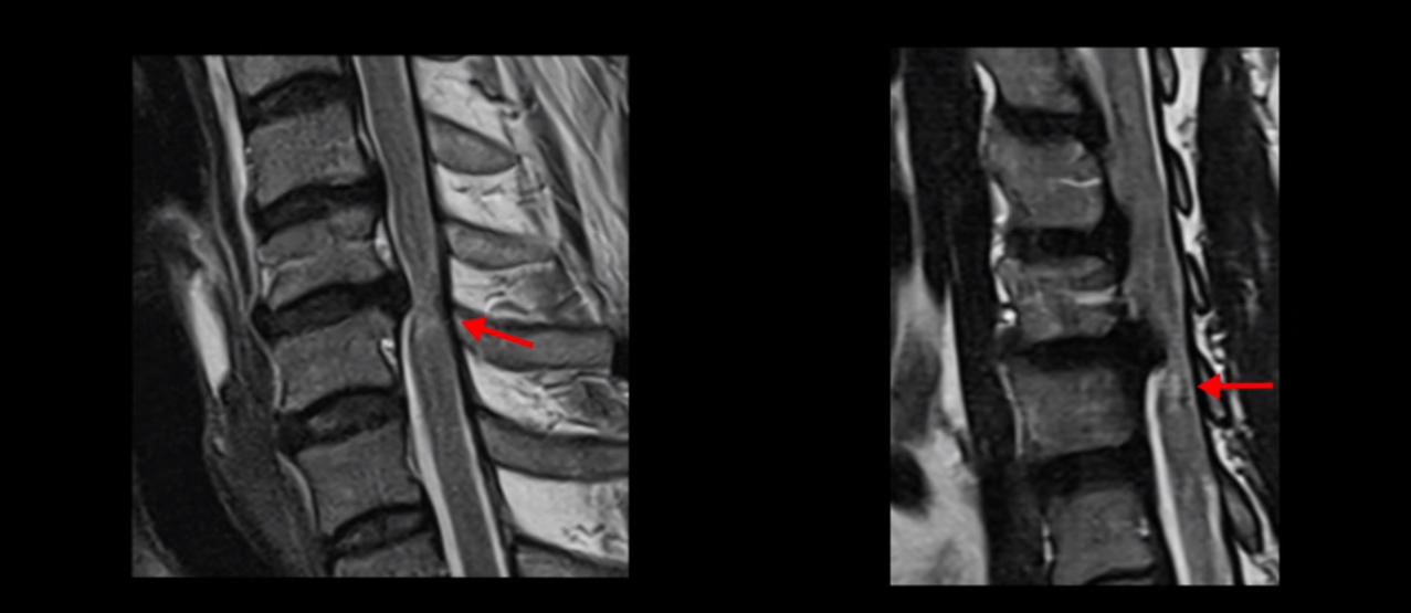 척수 신경이 눌려서 손상된 사인이 하얗게 보입니다. 이걸 경추척수증이라고 합니다.