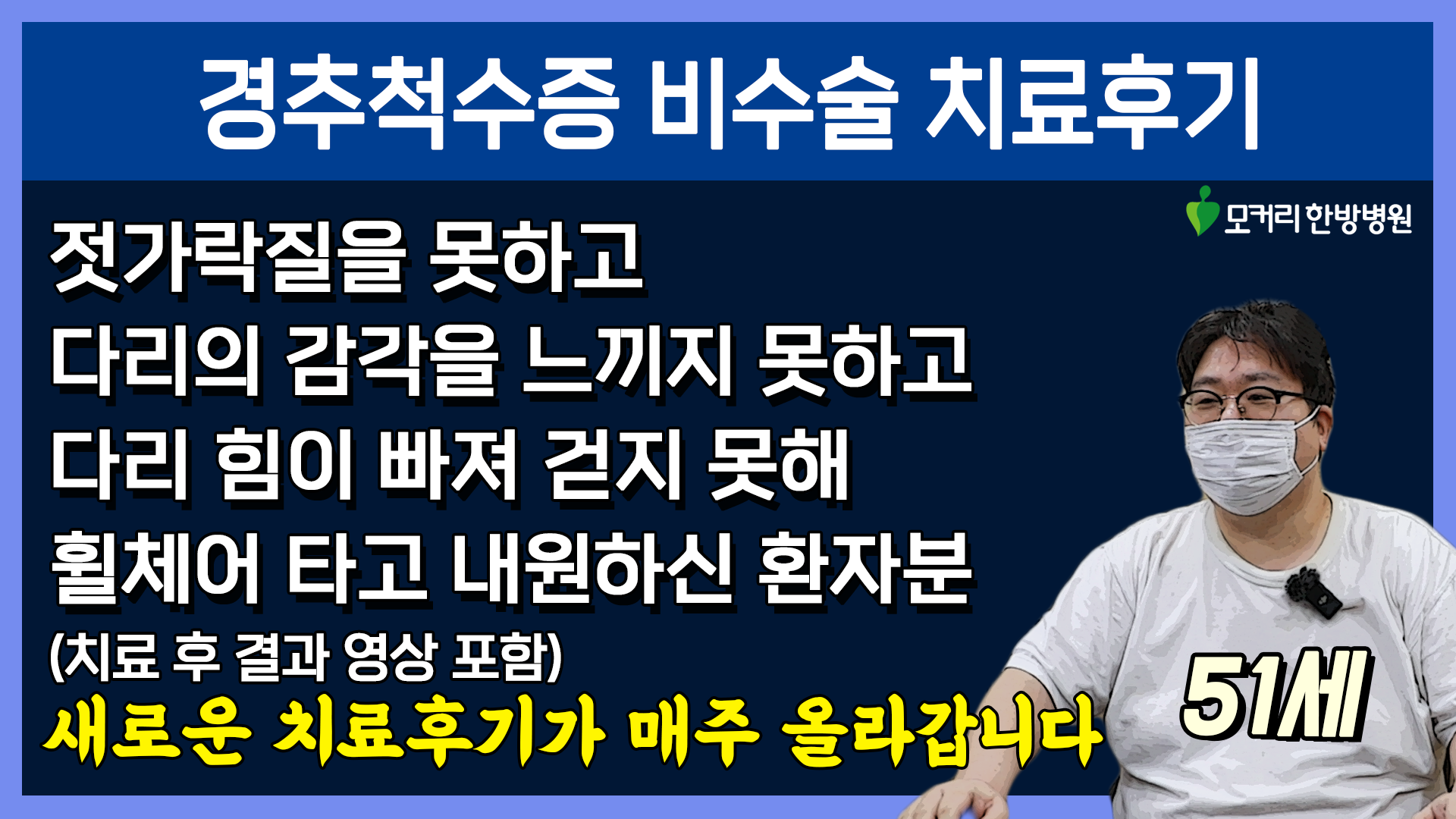 또 저희 치료후기를 보시면 아시겠지만, 척수증은 수술 후에도 팔이나 다리에 마비나 통증이 남아있는 분들이 많습니다. 척수증 수술 후 남아 있는 마비 증상과 통증에 진짜 필요한 치료가 저희 근육신경재활치료입니다. 척수증 수술 후 남아 있는 마비 증상이나 통증을 호전시키는데 근육신경재활치료는 정말 좋은 치료입니다. 이런 척수증 수술 후 남아 있는 마비와 통증 치료 후기 영상도 있으니까 그런 치료 후기들도 자세히 보시길 바랍니다.