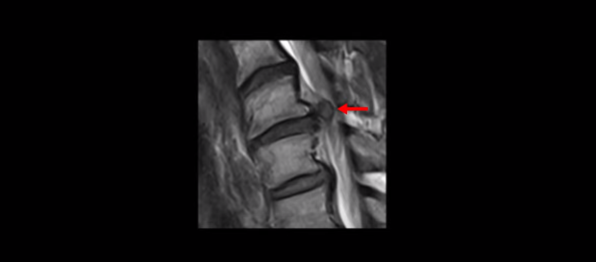 이분 목 MRI를 보면 6번, 7번 디스크에 매우 심한 디스크 파열이 있습니다.