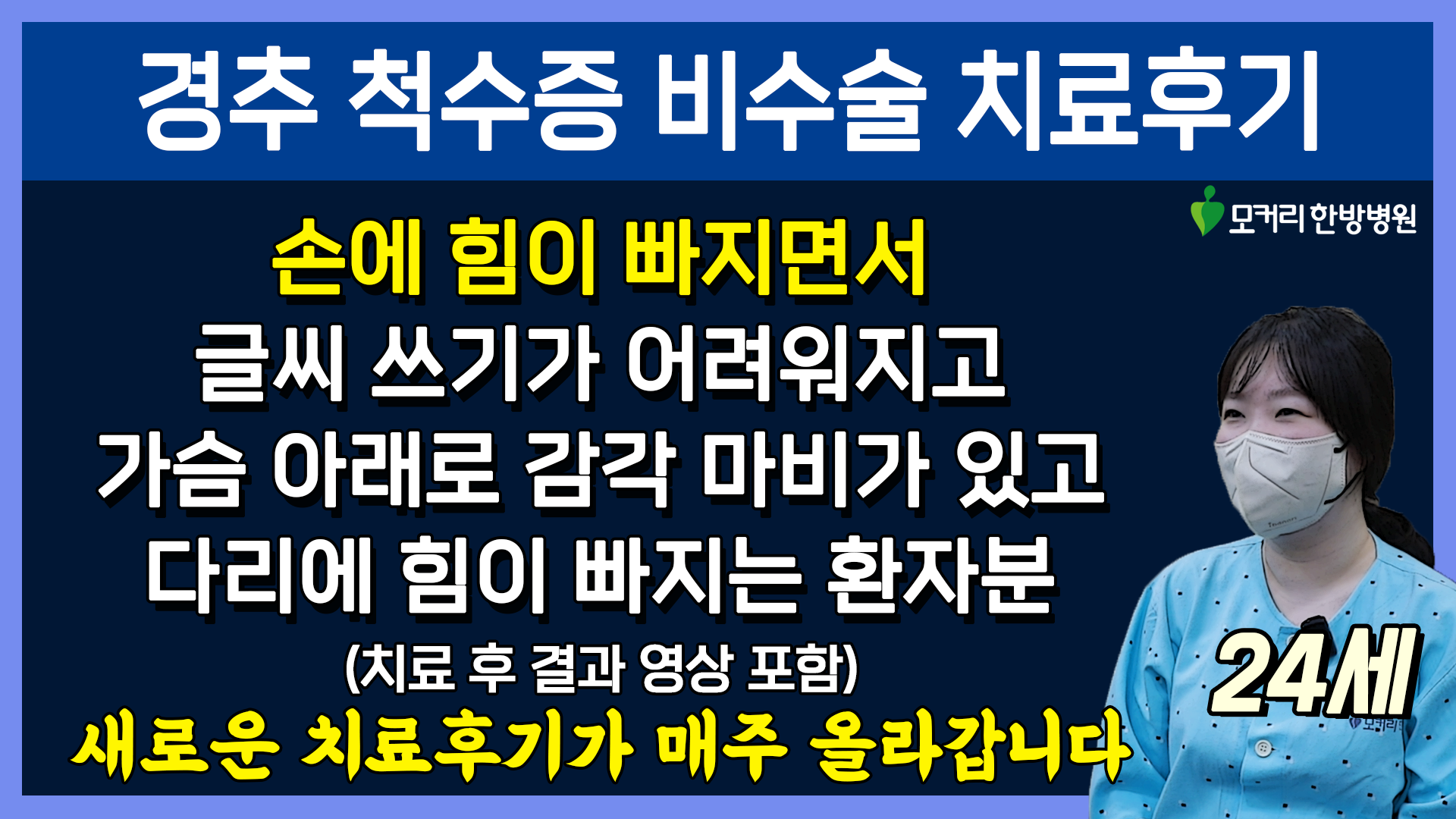 모커리는 엄마 지인 소개를 통해서 오게 됐습니다. 저희 가족은 원래 한방병원을 좋아했어요. 그리고 제가 11년 전에 교통사고 당했을 때 모커리를 한 번 왔었어요. 그래서 이런 병원이 있었다는 걸 알고는 있었는데 이번에도 수술을 안 하면 좋겠는데 수술 전에 다른 걸 치료해볼 수 있을까 했을 때 떠오르는 게 이 모커리한방병원이어서 소개로 오게 되었습니다.